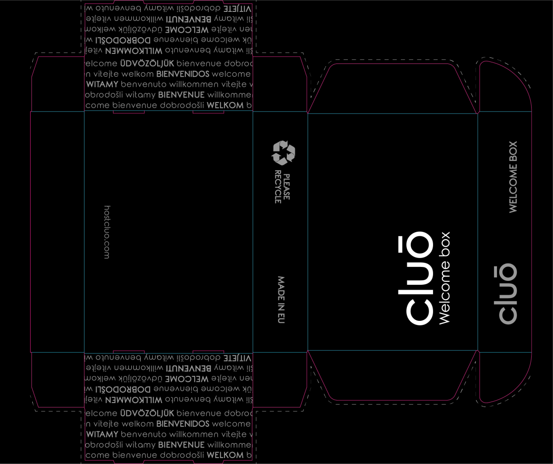 Osim brandinga, dizajnirali smo sadržaj i kutiju “Welcome box”. Kutija ja izrađana po mjeri proizvoda koje ona sadržava. Boja je bogata crna s decentnim pozdravnim porukama na stranicama te bijelim logotipom na prednjoj strani. Dizajnirali smo i posebne spužvice, one su okrugle i crno – bijele sa Cluo znakom.