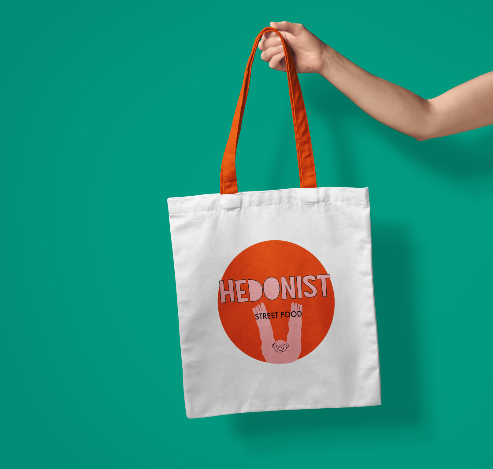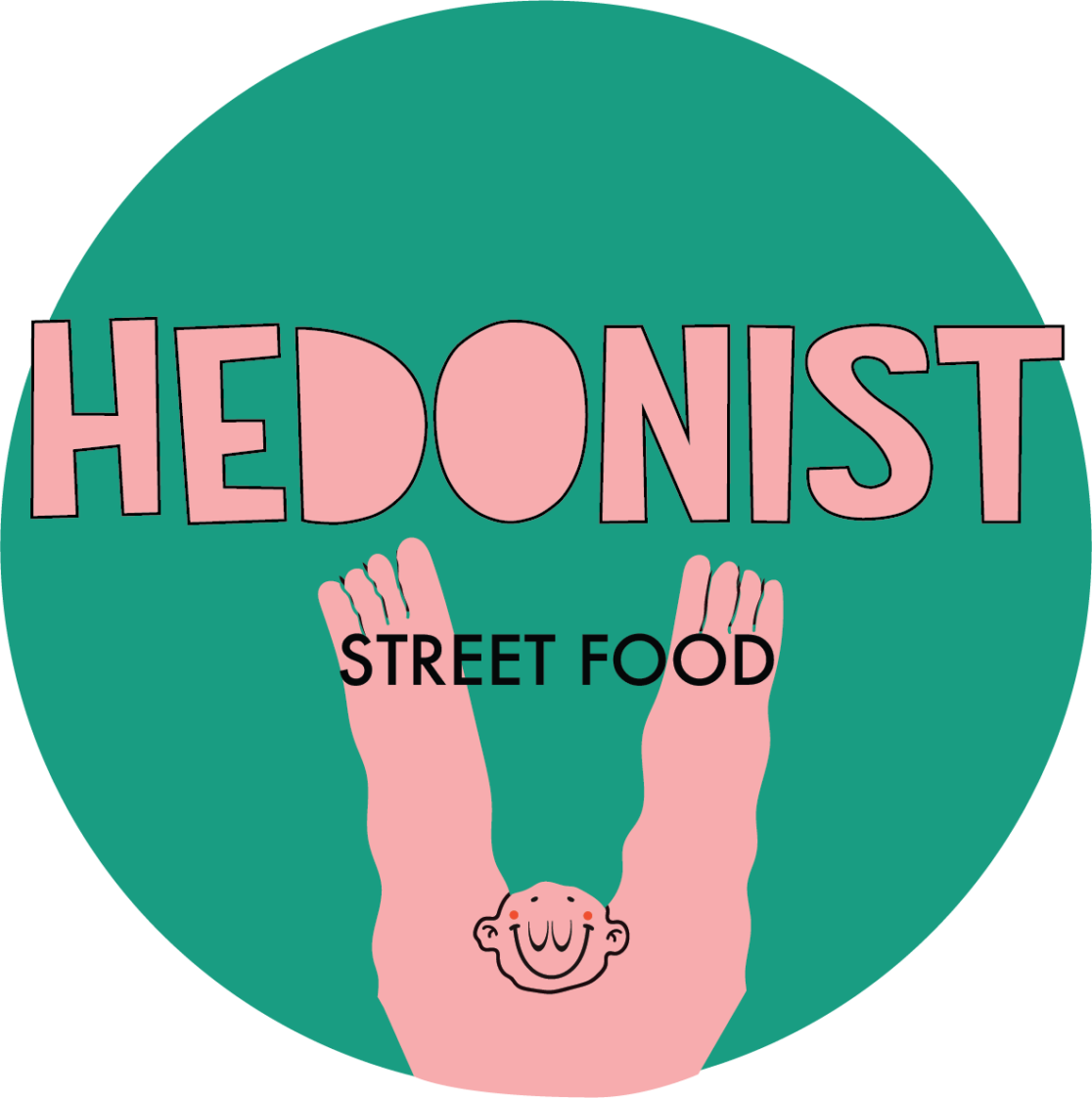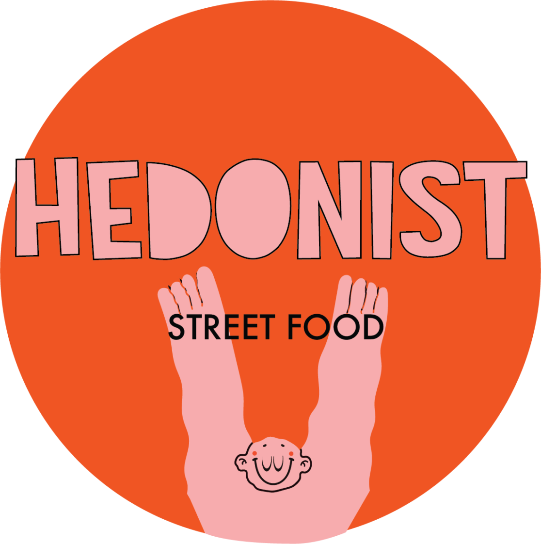 Vjerujemo da je hedonizam usko povezan s konzumacijom dobre hrane. Uživanje u hrani potiče sva osjetila od taktilnog koji počinje s rukama do okusnog koji završava u ustima. Zbog toga su ruke bile inspiracija pri kreiranju ovog vizualnog identiteta. Stvorili smo lika koji svojim velikim, podignutim rukama i smiješkom predstavlja apsolutnu sreću i zadovoljstvo koju čovjek osjeća kada dođe u Hedonist street food.