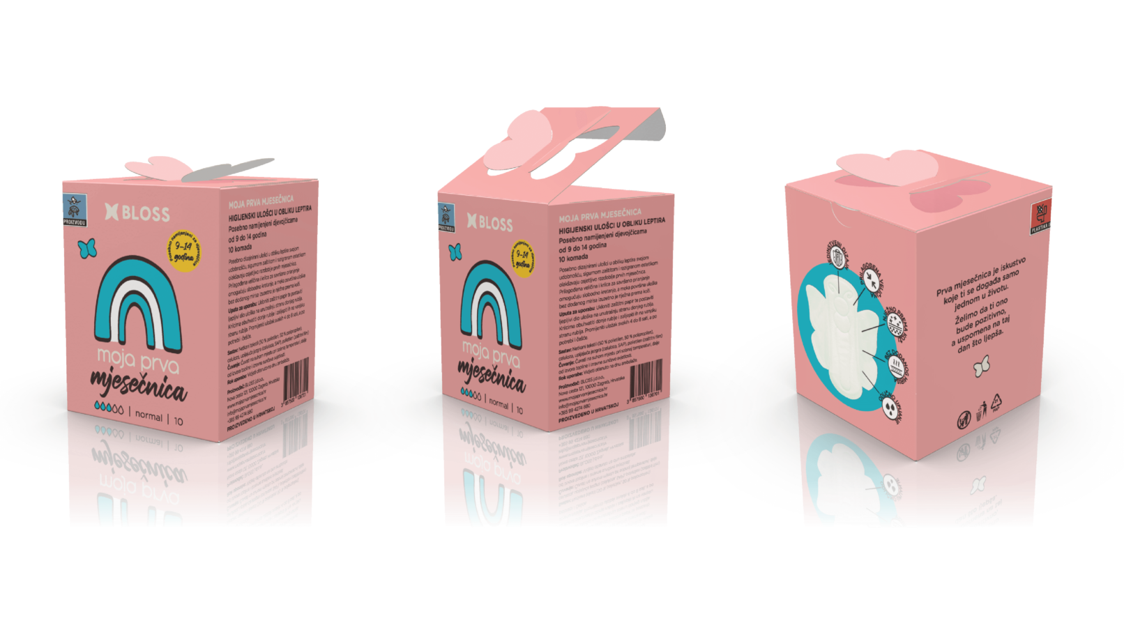Naša inspiracija je metamorfoza leptira, najčudesniji prirodni proces. Upravo zato higijenski ulošci ‘Moja prva mjesečnica’ imaju oblik leptira, a na vrhu kutije također se nalazi leptir. Iz zaigranog dječjeg svijeta, prva mjesečnica uvodi djevojčicu u svijet žene, a mi želimo da taj svijet bude lijepo mjesto jer je lijepo biti žena.